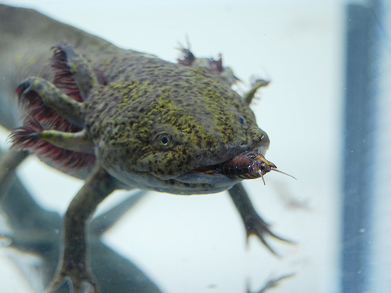 与える時には先の丸まったピンセットで胸のあたりをつまみ、虫を温水で洗ってから、アホロートルに見える所まで持っていきます。慣れると虫が水に浸かる前に水面に近づいてくる程になります。