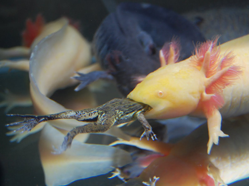 信じられないかもしれませんが、アホロートルはけっこう頭が良い生き物で「仲間」に対しては愛着を示してくれます。単独で飼育していると、おとなしく穏やかな性格で、ある意味では穏やかというよりも鈍感で反応が乏しい生き物です。