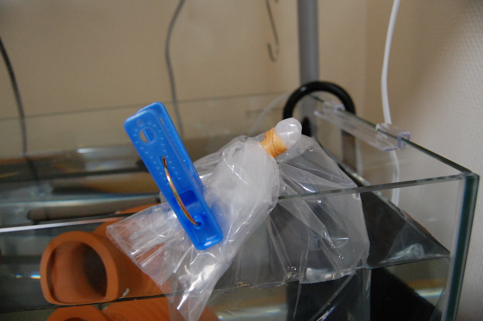 自宅に連れて帰ったら、まずは袋のまま水槽に浮かべて、袋の中と水槽の水温が同じになるまで10分~15分そのままにします。これで温度差によるショックが起こるのを防ぎます。また、アホロートルの方は水槽に放される前に袋の中から新しい住み家をよく観察できます。照明器具の付いている水槽の場合--この段階では切っておいてください。